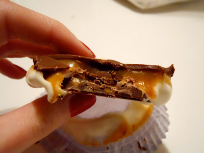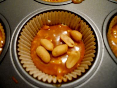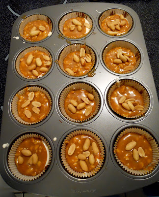 For the Milky Way cups, I poured in the melted caramel: For the Snickers, I mixed in chopped peanuts: But even for someone who doesn’t like peanuts, they didn’t look peanut-y enough. I added a few extra peanuts to each cup. Lastly, I topped each cup with a final layer of chocolate mix.