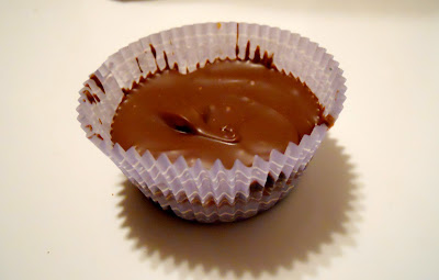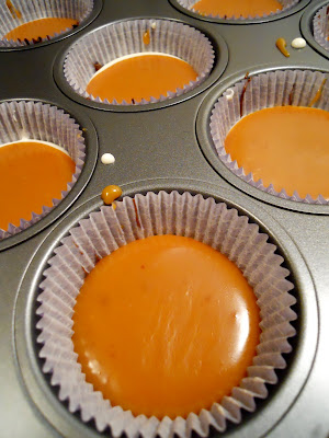 I made my candies in cupcake liners because I thought that’d be easier to distribute than making them in bar form. To make the first layer, I melted milk chocolate chips and butterscotch chips and poured the melted mixture into 24 cupcake liners.