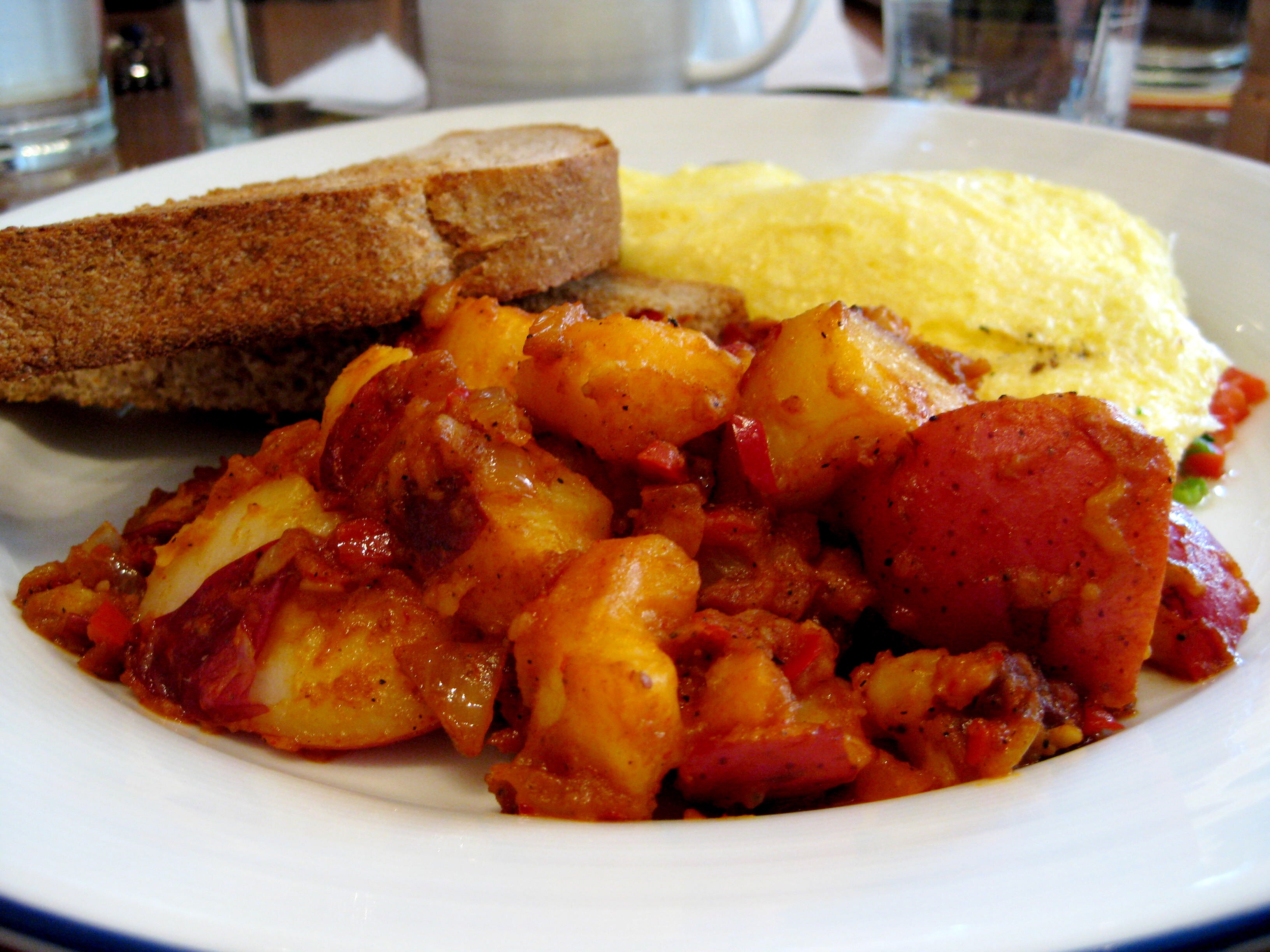 The potatoes on the side were creamy and spicy, complimenting the savory omelet.
